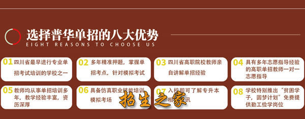 四川普华单招培训学校是一所专注于单招考试培训的教育机构,拥有优秀的师资力量、全面的培训课程、舒适的学习和生活环境以及良好的升学率和就业前景。