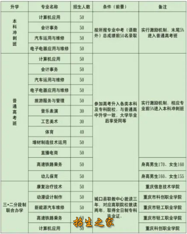 学校与多所高职院校联合开设物联网技术应用、新能源汽车运用与维修等“3+2”专业,学校已形成产教融合校企合作长效机制,建成秦巴山绿色发展乡村振兴学院、秦巴山旅游服务现代产业学院;建成计算机应用、汽车运用与维修、旅游服务与管理3个市级紧缺骨干专业和汽车运用与维修市级优质专业;建成计算机应用市级专业实训基地、旅游服务与管理专业基地、汽车运用与维修专业虚拟仿真实训基地;新增康养休闲旅游服务、增材制造技术应用、休闲体育、工艺美术等专业。为学生搭建艺体高考、对口高职考试、“3+2”等多元化成长成才平台,近三年来毕业生升入高等院校比例达到97%以上。