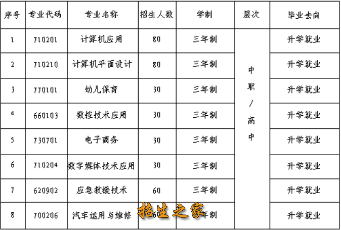 1.招生对象:初中应、往届毕业生,秋季学期正式入学后,建全国统一职业高中学籍。